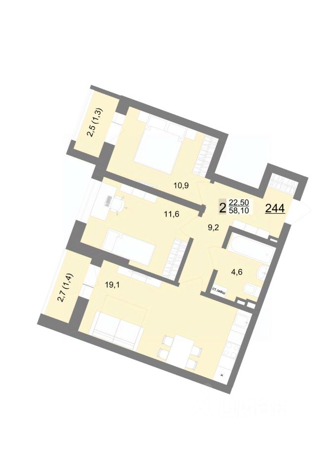 Общая площадь58,1 м2
