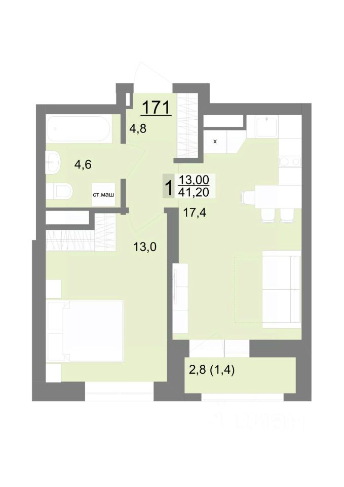 Общая площадь41,2 м2