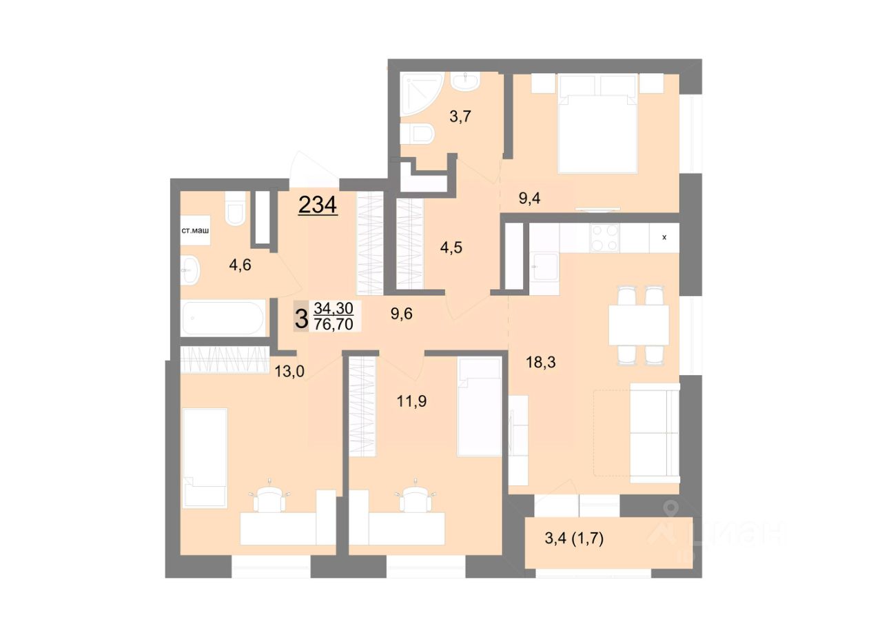Общая площадь76,7 м2
