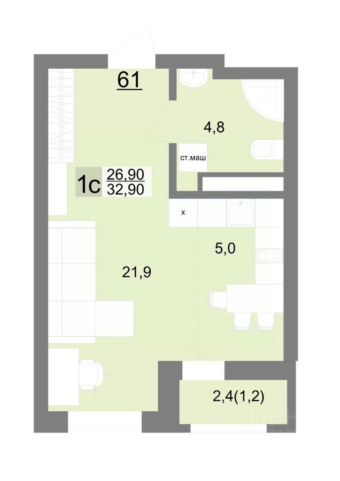 Общая площадь32,9 м2