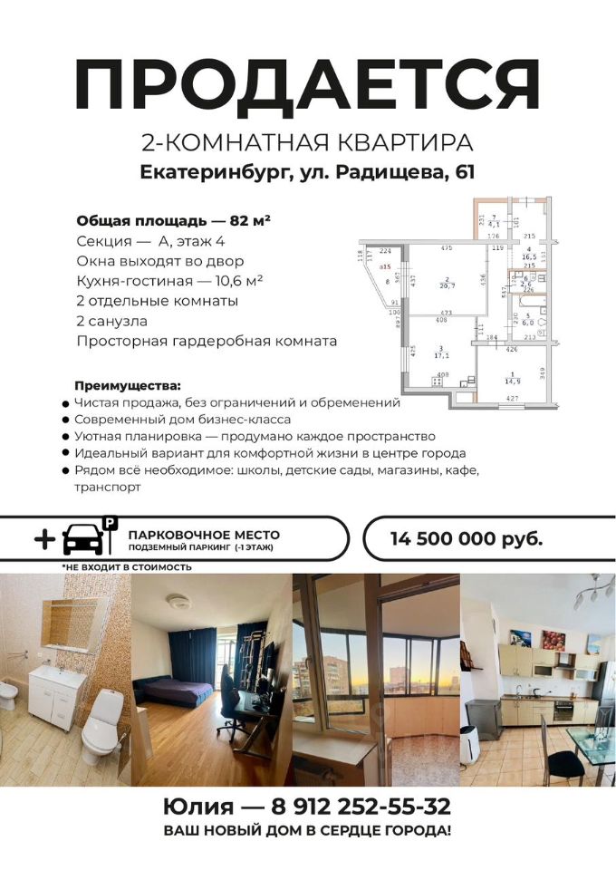 Евро 2 х комнатная квартира .Кухня -гостиная, 2 спальни, 2 санузла. Отдельная гардеробная комната. 5 мин ходьбы до центральных улиц, трамвайная остановка рядом с домом, В собственности больше 5 лет. Нет ипотеки, нет обременении, мат капитал не использовался. Собственник я и дочь совершеннолетняя, 3/7. Могу оставить диван в большой комнате. А так мебель по согласованию. Быстрый выход на сделку. Агентов не беспокоить. Продаётся уютная квартира площадью 82 квадратных метра на четвёртом этаже монолитного дома новой постройки (2010 год), расположенного в престижном районе Екатеринбурга Юго-Западном микрорайоне. Квартира идеально подойдёт тем, кто ценит комфорт, безопасность и качество жизни.