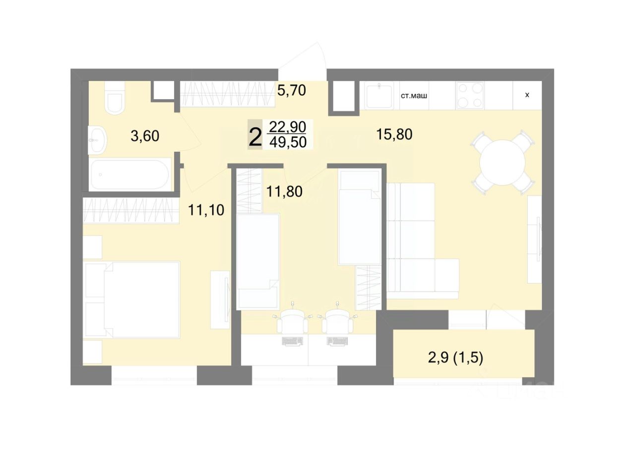 Общая площадь49,5 м2