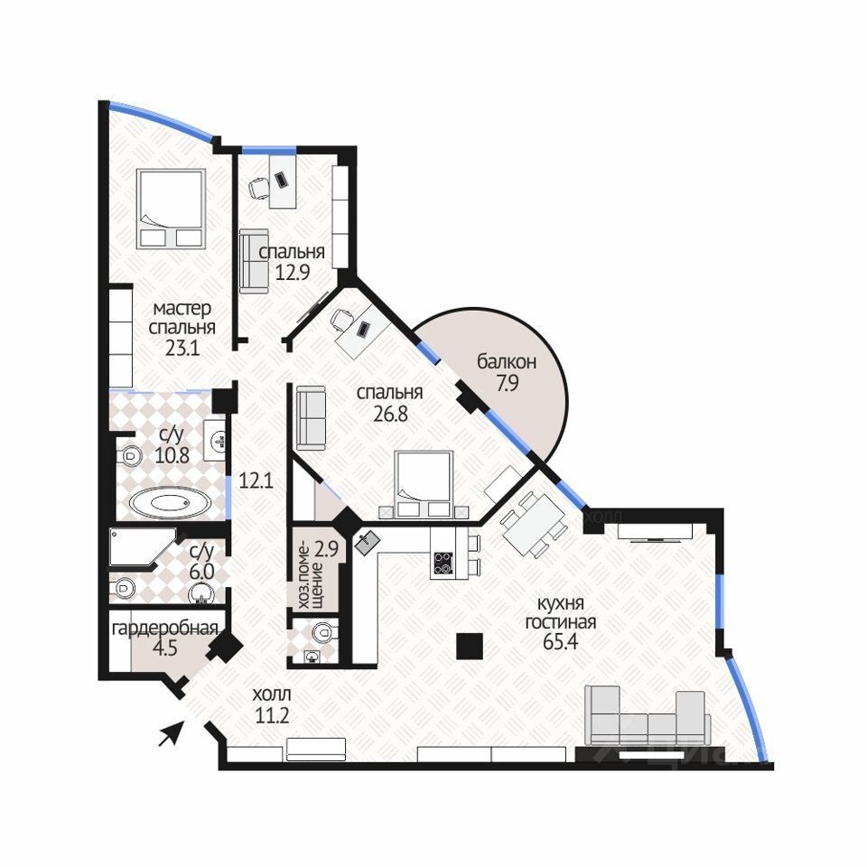 - Квартира идеально подходит для семьи с 2-3 детьми. Планировка включает кухню-гостиную, мастер-спальню, 2 санузла, кабинет и просторную детскую. Обстановка позволяет комфортно разместить всю семью, при этом оставив свободным кабинет для работы из дома.