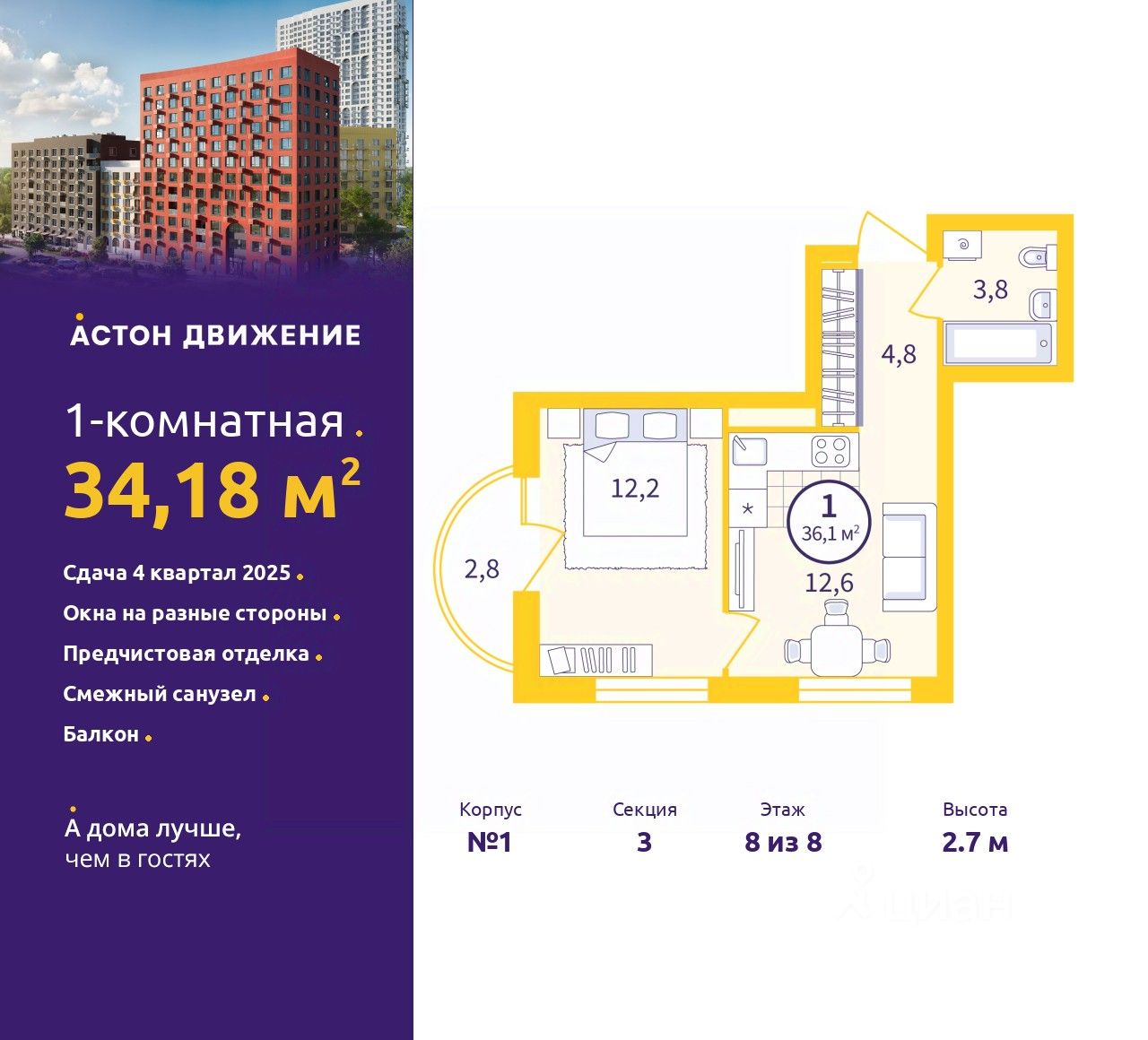 Однокомнатная квартира от застройщика с предчистовой отделкой в ЖК ''Астон.Движение'' на 8 этаже. Общая площадь: 34.18 кв.м., жилая: 12.2 кв.м., площадь просторной кухни-столовой: 12.6 кв.м. Угловая квартира, окна oбecпeчивaют paвнoмepнoe ocвeщeниe в тeчeниe дня. В квартире один балкон, один совмещенный санузел. Высота потолков 2.7 м.