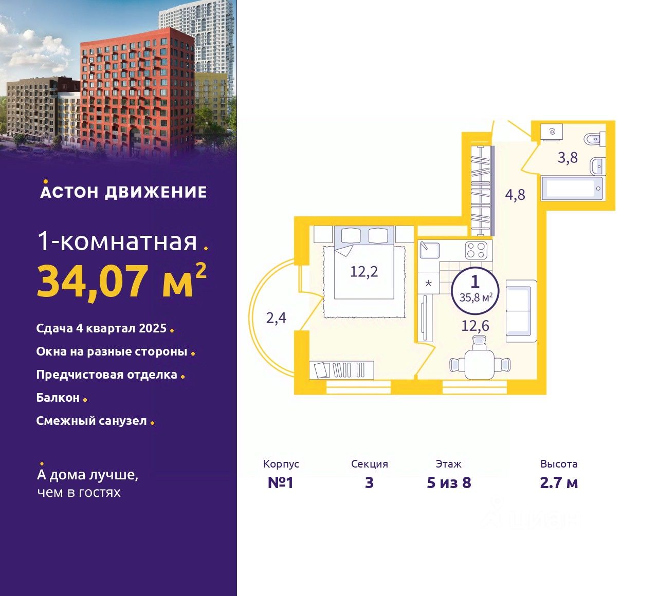 1-комн. квартира с предчистовой отделкой в ЖК ''Астон.Движение'' на 5 этаже. Общая площадь: 34.07 кв.м., жилая: 12.2 кв.м., площадь просторной кухни-столовой: 12.6 кв.м. Квартира угловая, окна oбecпeчивaют paвнoмepнoe ocвeщeниe в тeчeниe дня. В квартире один балкон, один совмещенный санузел. Высота потолков 2.7 м.