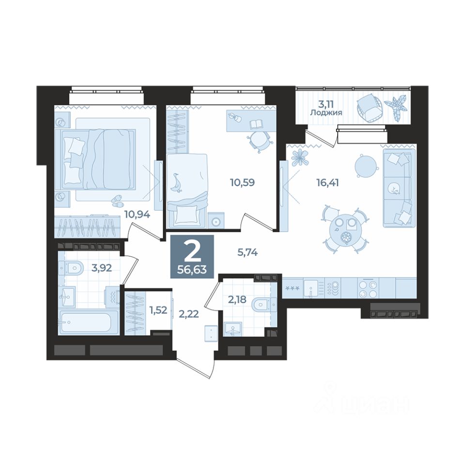 Общая площадь56,63 м2