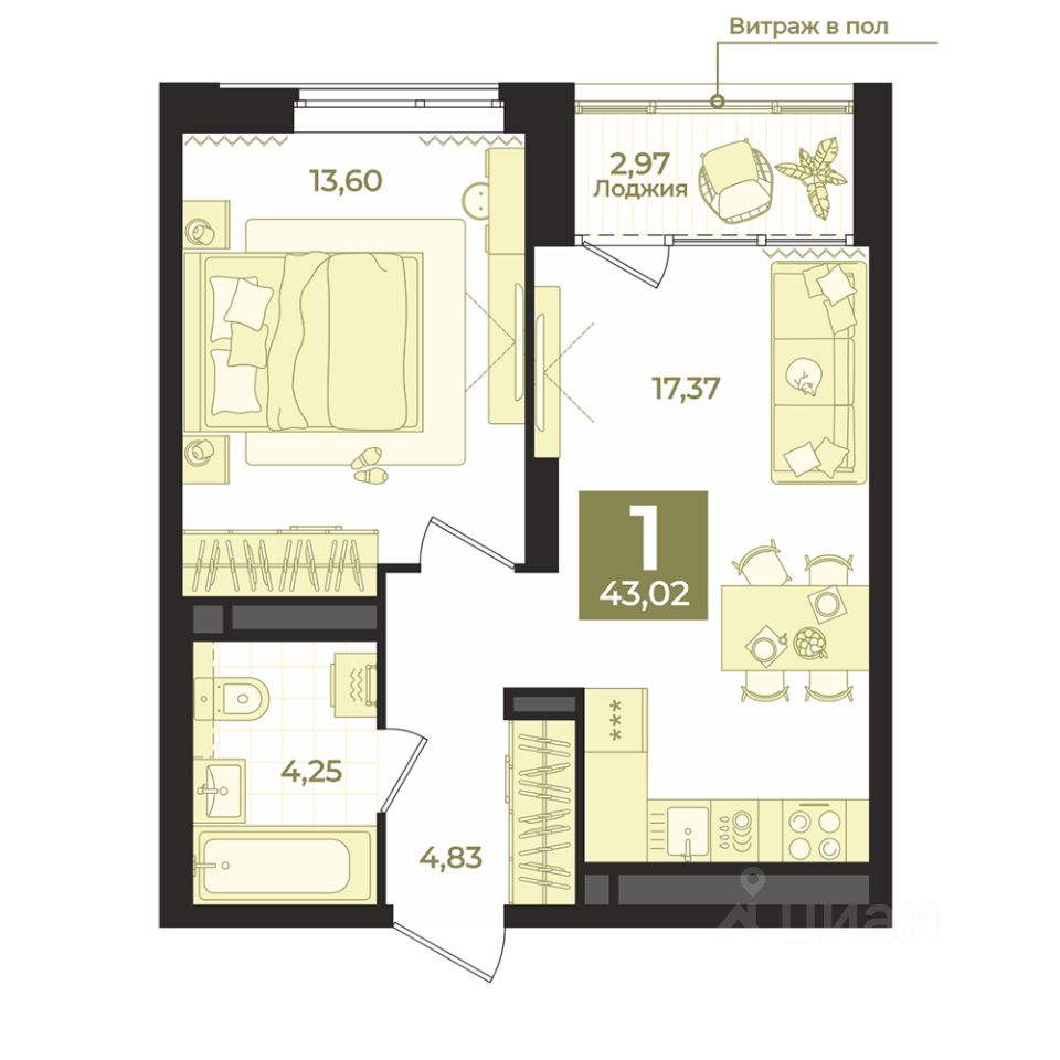 Общая площадь43,02 м2