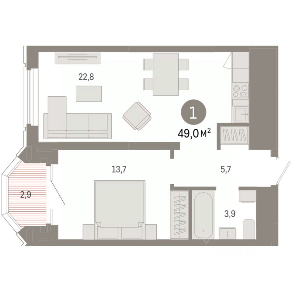 Квартира с кухней-гостиной и одной спальней в квартале ''На Некрасова''. Особенности планировки: лоджия, предчистовая отделка. квартиры в нашей базе: НКР02-Ж1.14.2.