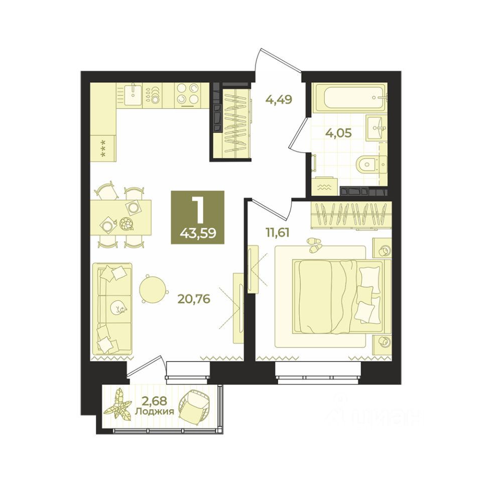 Общая площадь43,59 м2