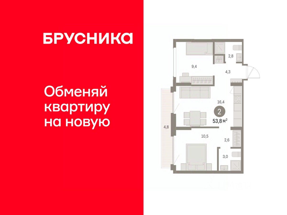 Квартира с кухней-гостиной и двумя спальнями в Бруснике в Академическом. Особенности планировки: балкон, вид во двор, гардеробная, мастер-спальня, предчистовая отделка, разнесённые спальни. квартиры в нашей базе: АКД05-Ж3.4.7.