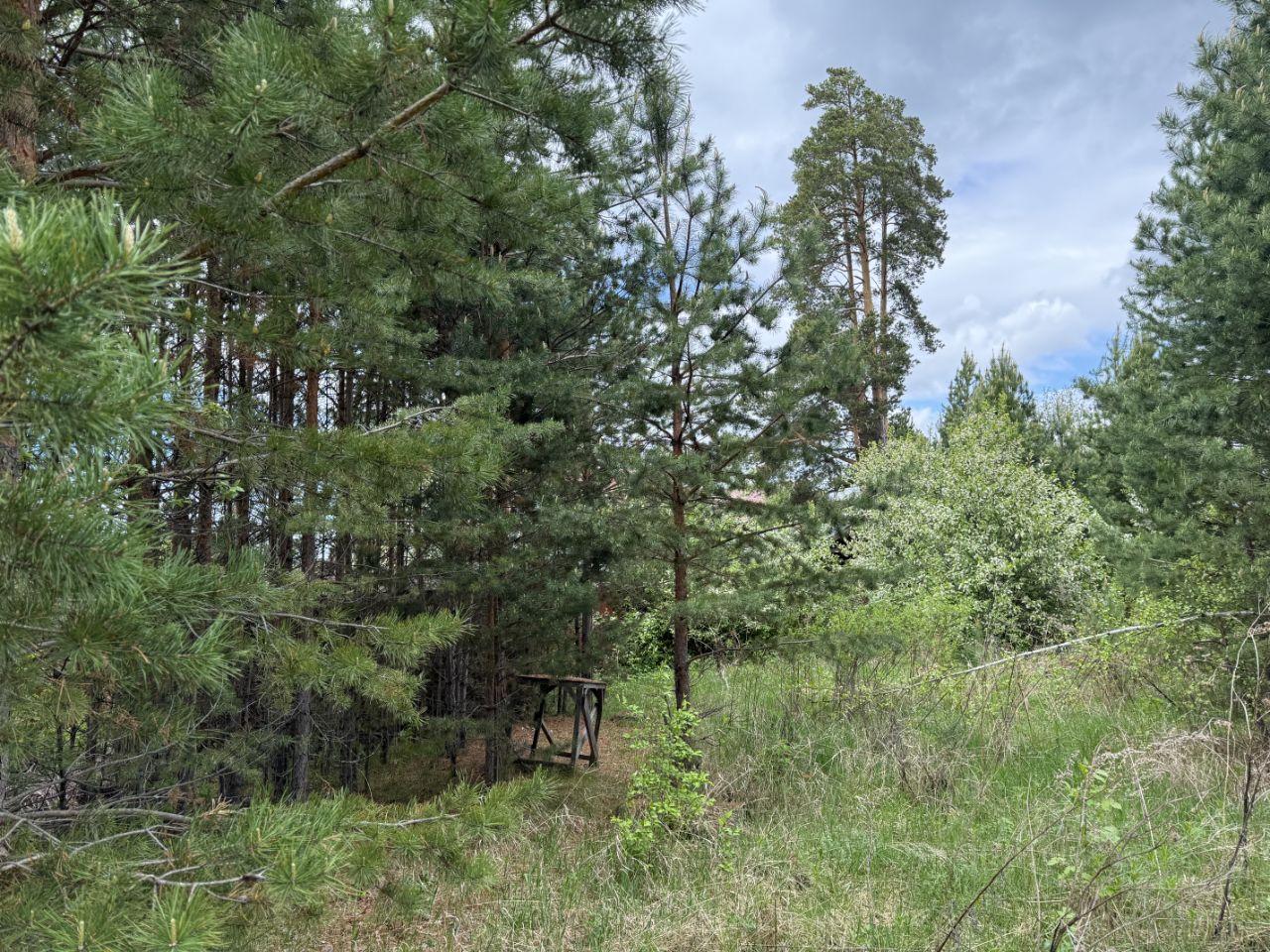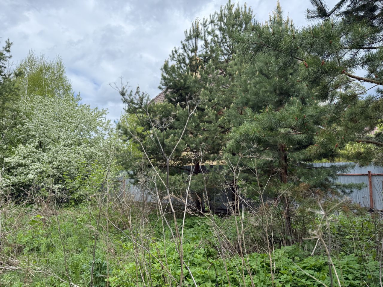 Участок с молодым лесом, обнесен забором, есть металлический гараж