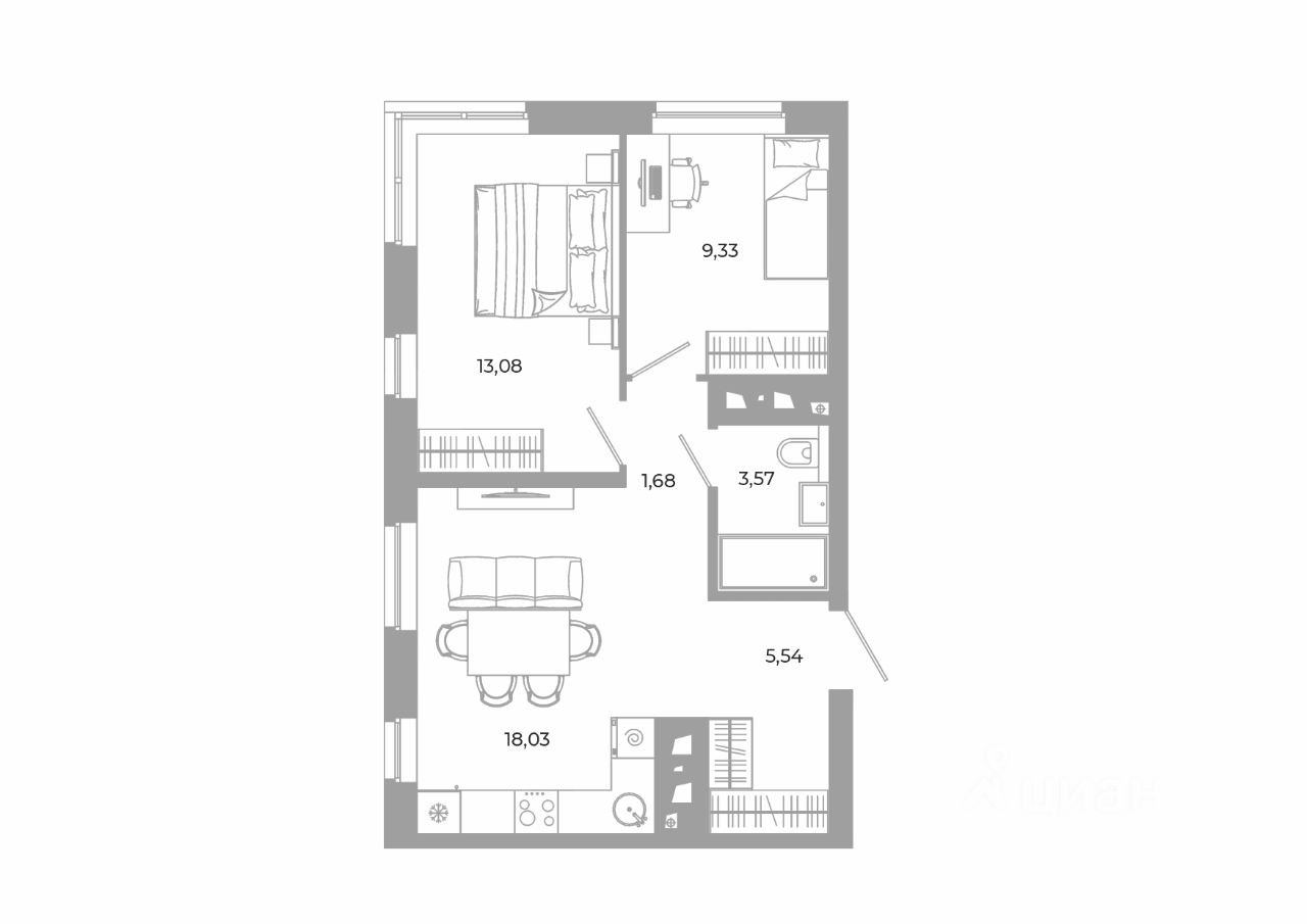 - Кладовые помещения на каждом этаже и на -1 этаже. В проекте 25 планировочных решений: от уютных студий от 21,51 м² до квартир с тремя спальнями и кухней-гостиной до 66,58 м² с функциональным разделением на гостевую и приватные зоны.