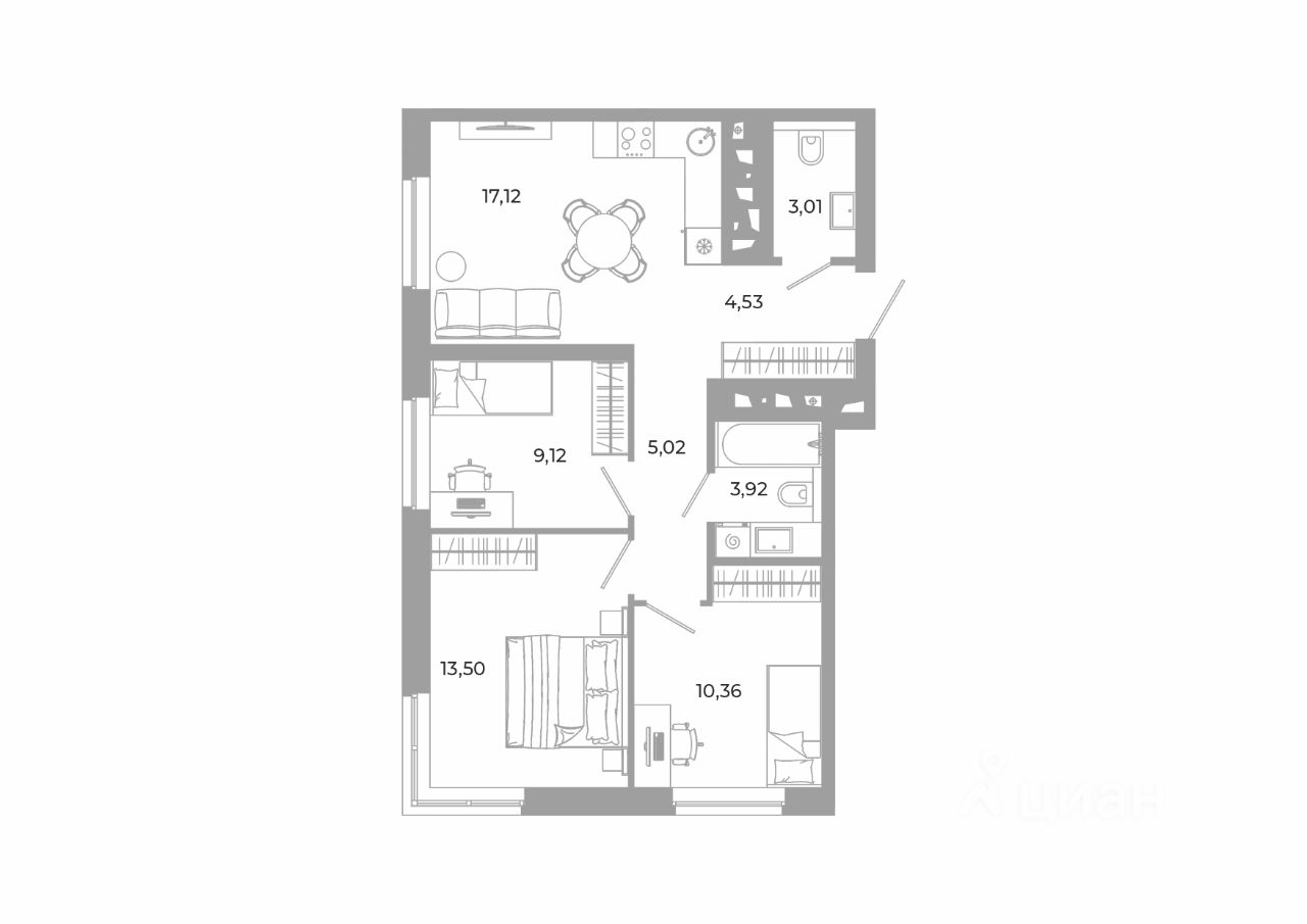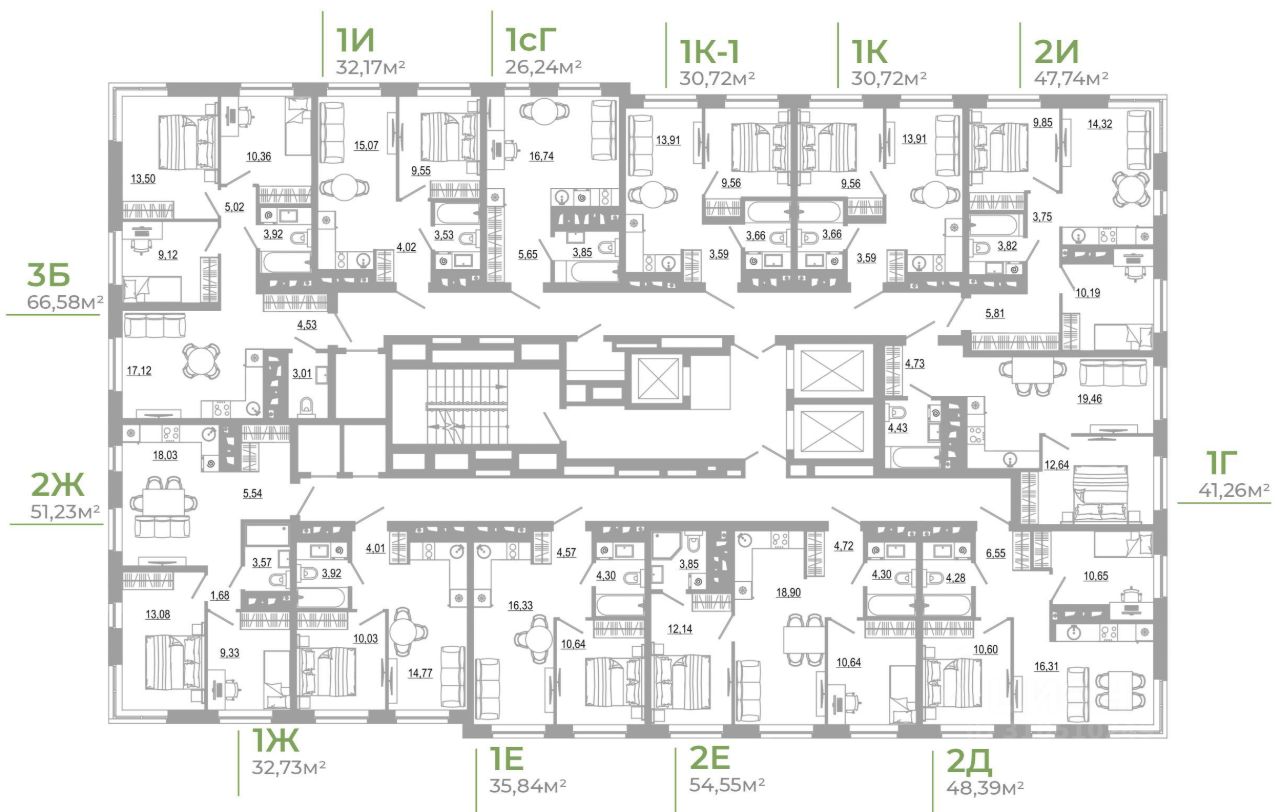 - Кладовые помещения на каждом этаже и на -1 этаже. В проекте 25 планировочных решений: от уютных студий от 21,51 м² до квартир с тремя спальнями и кухней-гостиной до 66,58 м² с функциональным разделением на гостевую и приватные зоны.