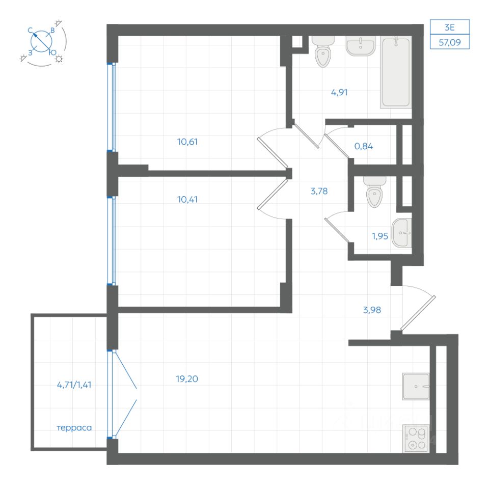 Общая площадь57,09 м2