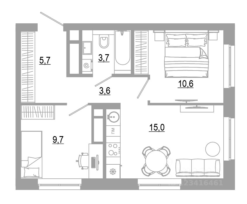 В комплексе представлено 25 планировок с площадью квартир от 21 м² до 65 м² для разных жизненных сценариев жизни: