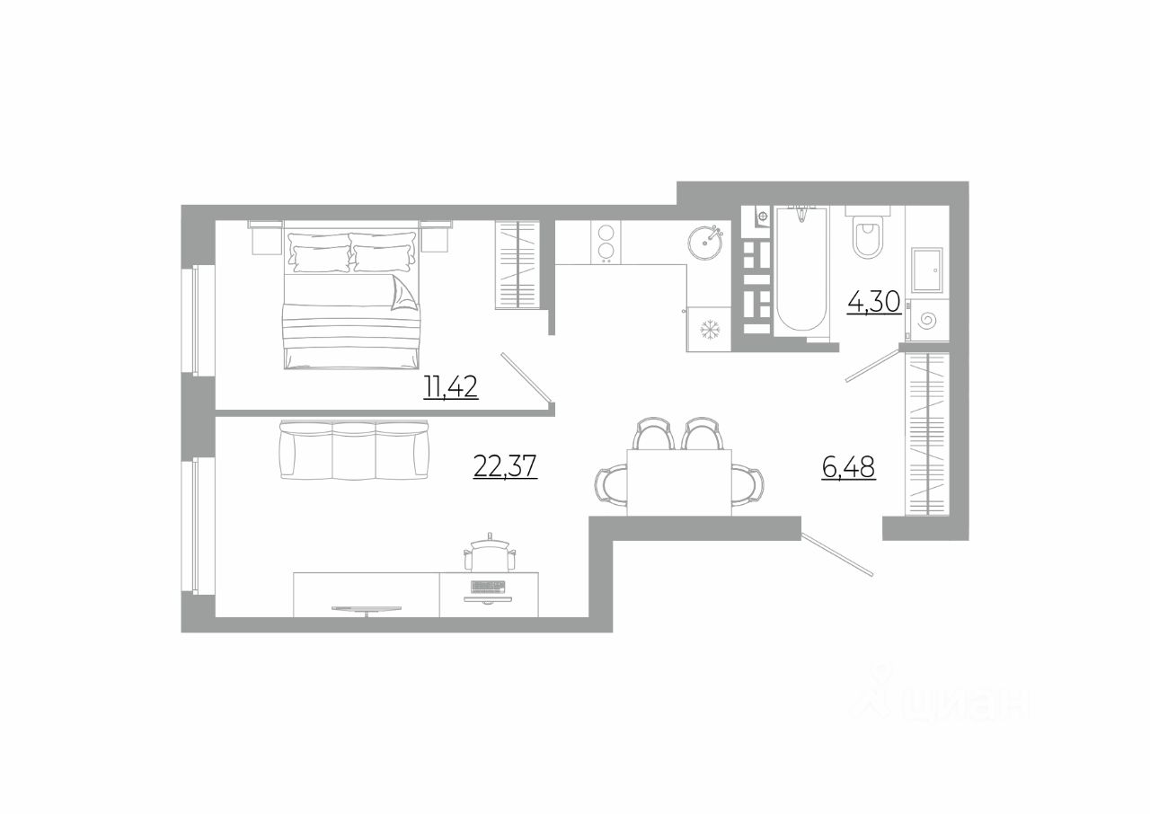 - Кладовые помещения на каждом этаже и на -1 этаже. В проекте 25 планировочных решений: от уютных студий от 21,51 м² до квартир с тремя спальнями и кухней-гостиной до 66,58 м² с функциональным разделением на гостевую и приватные зоны.