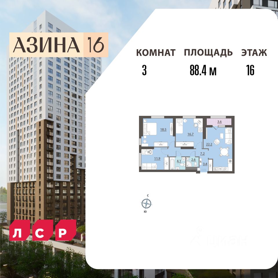Квартира располагается на 16 этаже 32-этажного дома в ЖК Азина, 16. Застройщик - ЛСР, сдача дома - I квартал 2026 года, высота потолков 2.72 м, есть мусоропровод. Подземная парковка. Обеспечение безопасности: видеонаблюдение, консьерж, пропускная система. Инфраструктура: школа, детский сад, детские площадки, спортивные площадки, места для отдыха, супермаркет, коммерческие объекты.