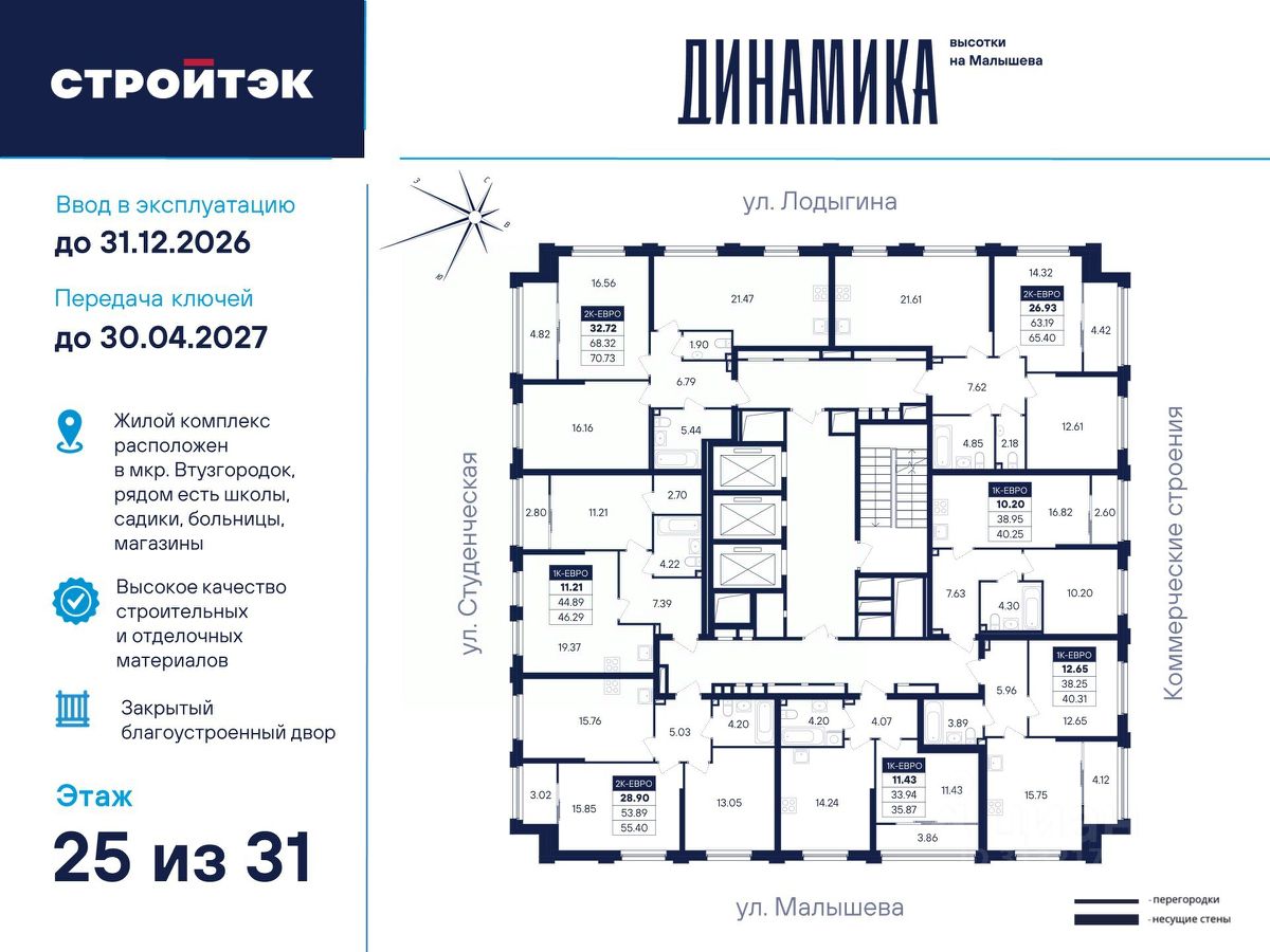 Настройте жизнь на максимум В Динамике воплощают мечты. Её фасады стремятся ввысь и рисуют силуэт ступеней — символа вашего движения, где всё задуманное сбывается. В интеллигентном микрорайоне Втузгородок всё под рукой. Пешком до остановки 5 минут, на машине до центра — 10. Соседство с торговыми комплексами и доступность ЕКАД входят в число преимуществ квартала наравне с близостью УРФУ, главных театров, филармонии, школ и детсадов. Рядом озеро Шарташ, которому около миллиона лет. Здесь катаются на сапах, лодках и катамаранах, а в Шарташском лесопарке вокруг озера — на велосипедах летом и лыжах зимой. Новое звучание района Выразительные башни Динамики притягивают взгляды издалека. Сплошные стеклянные витражи фасадов меняют восприятие проекта в зависимости от ракурса, времени года и суток. В квартирах с витражным остеклением алюминиевые оконные рамы и широкие подоконники визуально увеличивают пространство. Благодаря современным технологиям витражи обеспечивают дополнительную теплоизоляцию, помогая сохранять комфортный микроклимат в квартире и летом, и зимой. Отдых в вашем ритме Выбирайте досуг по душе для себя и семьи. Занимайтесь на тренажёрах и воркаут-комплексе, играйте в пинг-понг, футбол или баскетбол. Для детей — насыщенный плейхаб, который тренирует тактильность и равновесие в атмосфере безопасности и контролируемого риска. Размеренно прогуливайтесь меж декоративных холмов, под тенистыми навесами-перголами вблизи удобных скамеек. СТРОЙТЭК возводит Динамику в 3 этапа. Первый этап строительства Секция 1 — башня в 31 этаж. В ней 209 1- и 2-комнатных квартир и 21 уникальная планировка — как в классическом исполнении, так и с просторными кухнями-гостиными до 22 м квадратных. Мы сдадим дом в 4 квартале 2026 года и выдадим ключи не позднее 30 апреля 2027 года. В подъезде вас встретят просторные светлые холлы с уютным минималистичным дизайном бизнес-класса, комфортные помещения для колясок и самокатов, а также 3 надёжных лифта на 1 000 кг каждый. Живите легко — мы об этом уже позаботились. Автономная газовая котельная позволит не зависеть от центрального отопления, а закрытый паркинг на 82 места внутри стилобата с подъёмом до этажа избавит от лишней суеты. Технологии комфорта Обратите внимание на планировки с гардеробными и тёплыми лоджиями, где 5-камерный ПВХ-профиль заботливо защитит от непогоды. И особенно — специальный формат квартир с террасами на 2 этаже: здесь так приятно проводить время с гостями, загорать на шезлонгах или ужинать при свечах. В Динамике улучшенный стандарт отделки ''Комфорт+''. Помимо привычных сантехники и электрики, в него входят оконные стёкла Energy Light, которые помогают сохранять комфортную температуру, приточные клапаны вентиляции Air-Box и детские замки, особо прочный ламинат 33 класса и устойчивые к многократной покраске виниловые обои. Белые межкомнатные двери и плинтусы лаконично подчеркнут любую цветовую гамму, а надёжная сейф-дверь добавит спокойствия и беззаботных моментов.