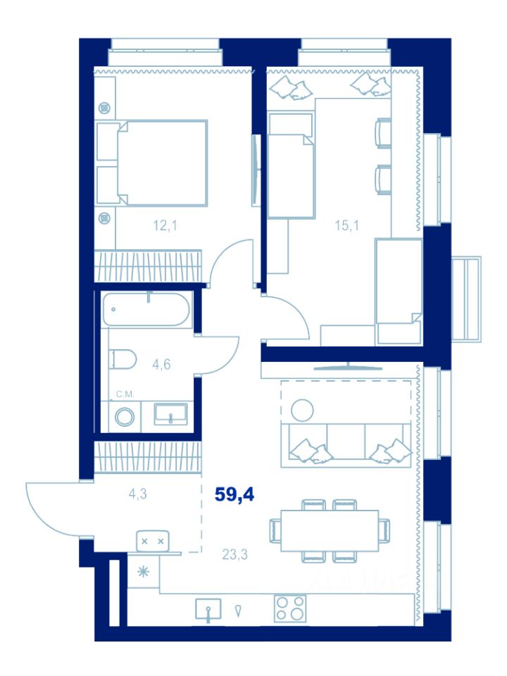 Здесь можно создать отдельную спальню, кабинет или просторную гостиную — планировка легко адаптируется под ваш стиль жизни.