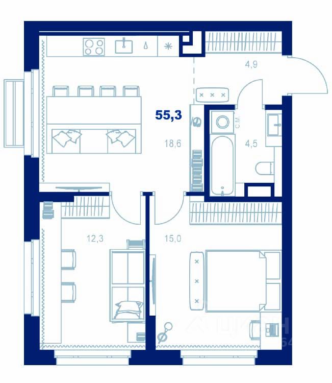Здесь можно создать отдельную спальню, кабинет или просторную гостиную — планировка легко адаптируется под ваш стиль жизни.