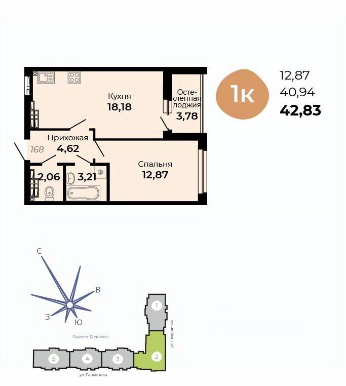 Общая площадь42,83 м2