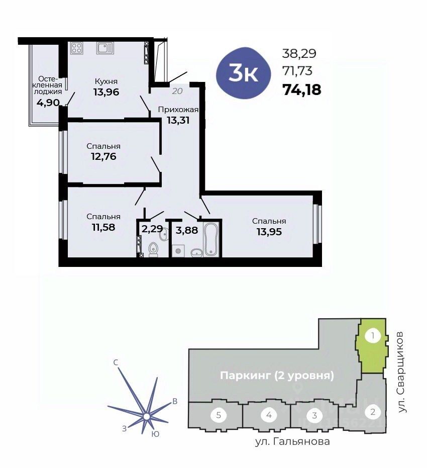 Общая площадь74,18 м2