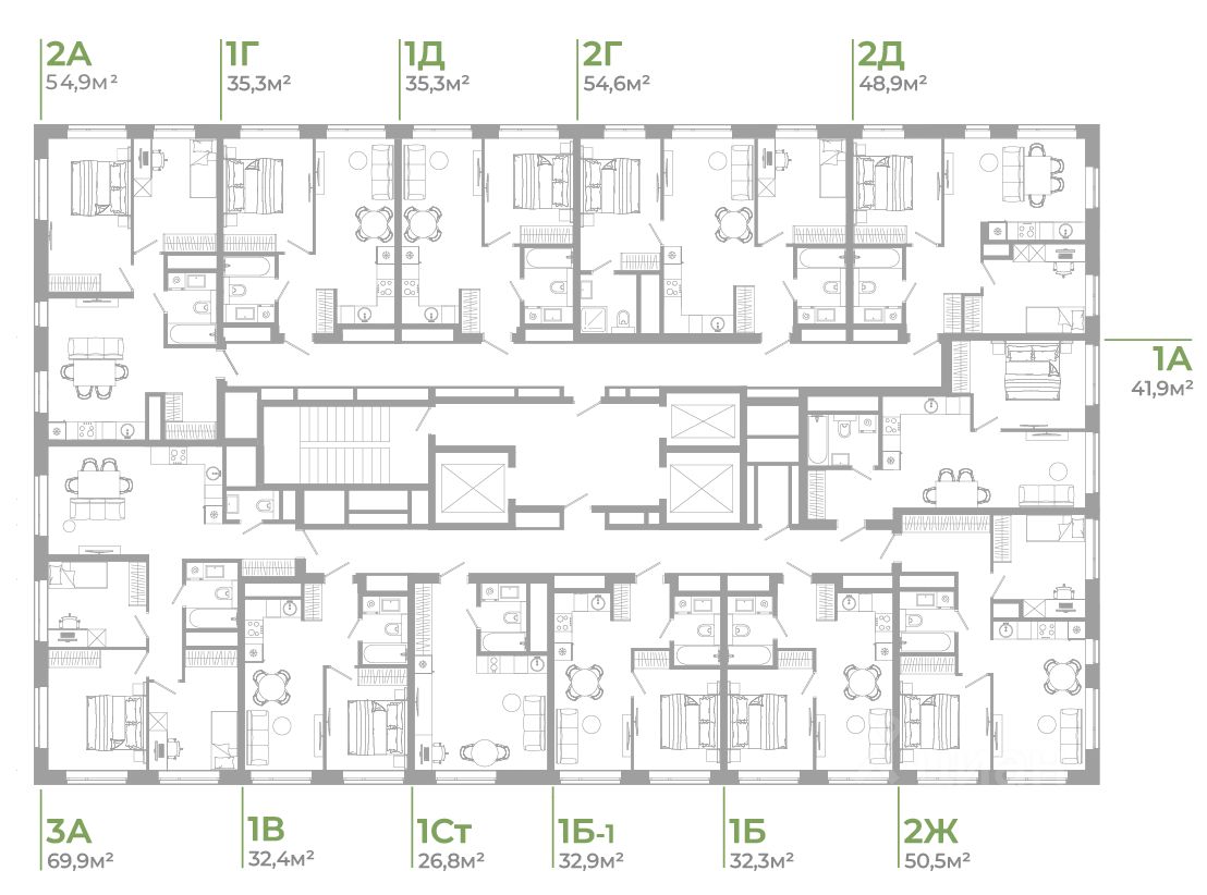В комплексе представлены десятки планировок с площадью квартир от 26,24 м² до 66,58 м². Каждая учитывает сценарии жизни, эргономичность и функциональность каждого квадратного метра. Для тех, кто ценит загородный формат жизни в спокойствии, но хочет оставаться в центре города, хорошим вариантом станут квартиры с террасами. Они расположены по четырём сторонам домов, а это значит, что из них открываются панорамные виды на 180 градусов с обзором на город и квартал. На террасах приятно проводить вечера, работать с комфортом, любуясь восходами и закатами, тренироваться или отдыхать.