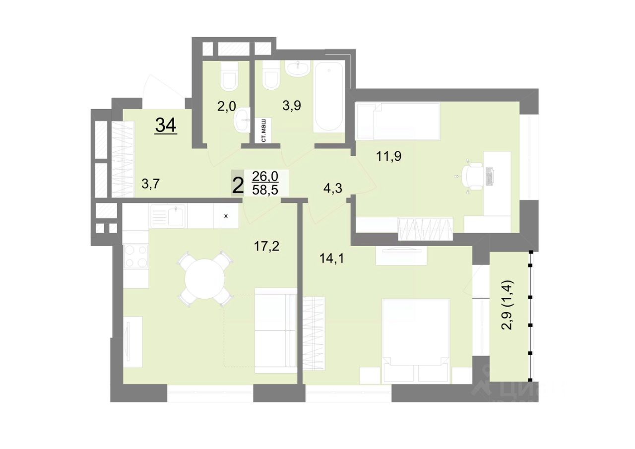 Общая площадь58,5 м2