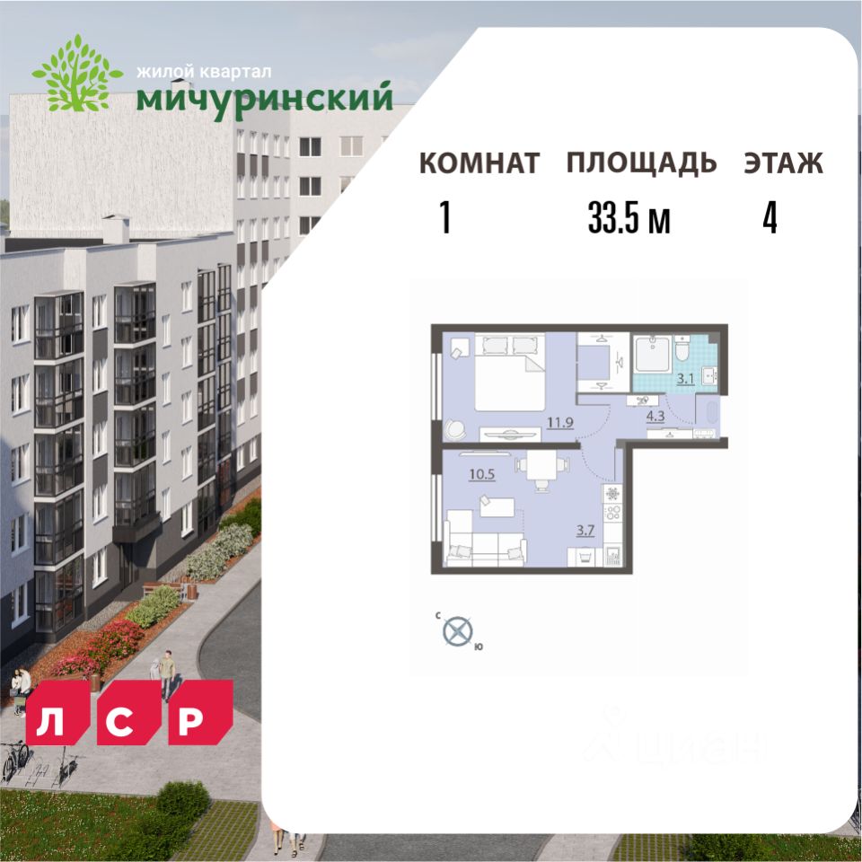 Квартира располагается на 4 этаже 8-этажного дома в ЖК Мичуринский. Застройщик - ЛСР. Недвижимость-Урал, сдача дома - IV квартал 2026 года, высота потолков 2.5 м. Парковка автомобилей - наземная. Инфраструктура: школа, детский сад, детские площадки, спортивные площадки, места для отдыха, супермаркет.