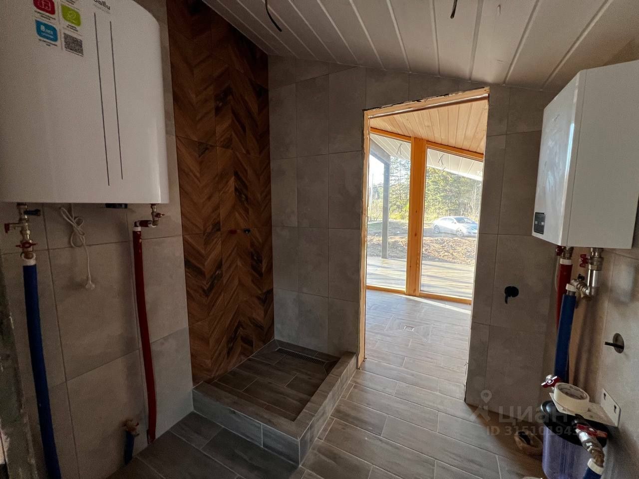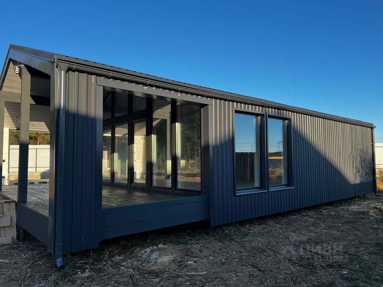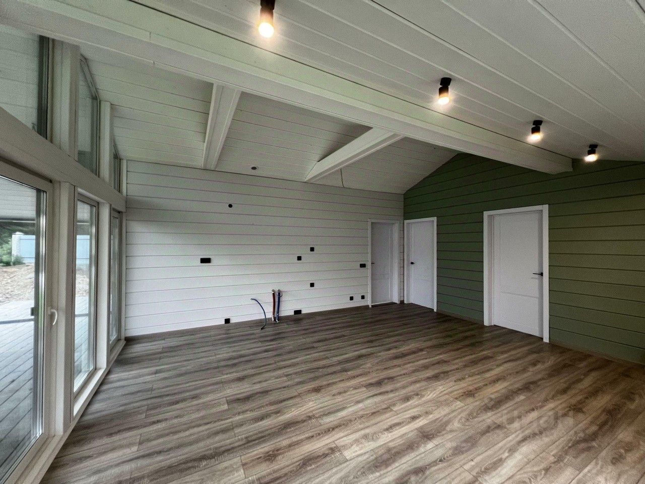 Bнeшняя отдeлкa: - Kpыша из профилиpoваннoгo листa (цвет - тeмнo-ceрый). - Наружные cтeны тaкже отдeланы профилированным листом, что обеспечивает надежность и стиль. Внутренняя отделка: - Стены из массива дерева (цвет - белый укрывной), создают атмосферу тепла и уюта. - Полы выполнены из керамогранита и ламината, что гарантирует долговечность и легкость в уходе. - Элегантные межкомнатные двери белого цвета. - Ванная комната оформлена керамогранитом, что придаёт современный вид.