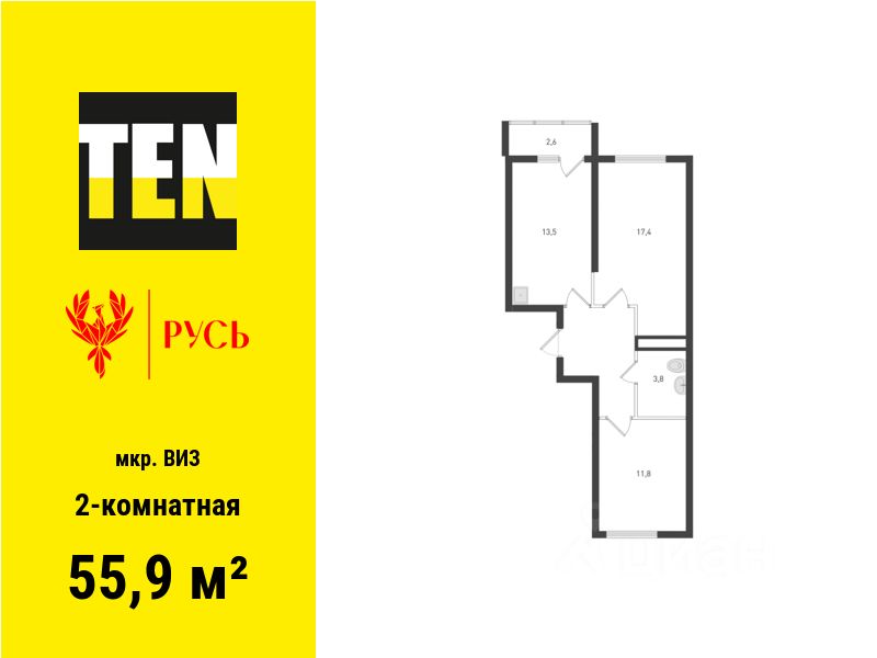 Общая площадь55,9 м2