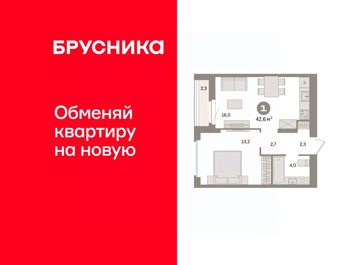 Квартира с кухней-гостиной и одной спальней в квартале ''Депо''. Особенности планировки: предчистовая отделка. квартиры в нашей базе: ДЕП07-Ж1.15.4.