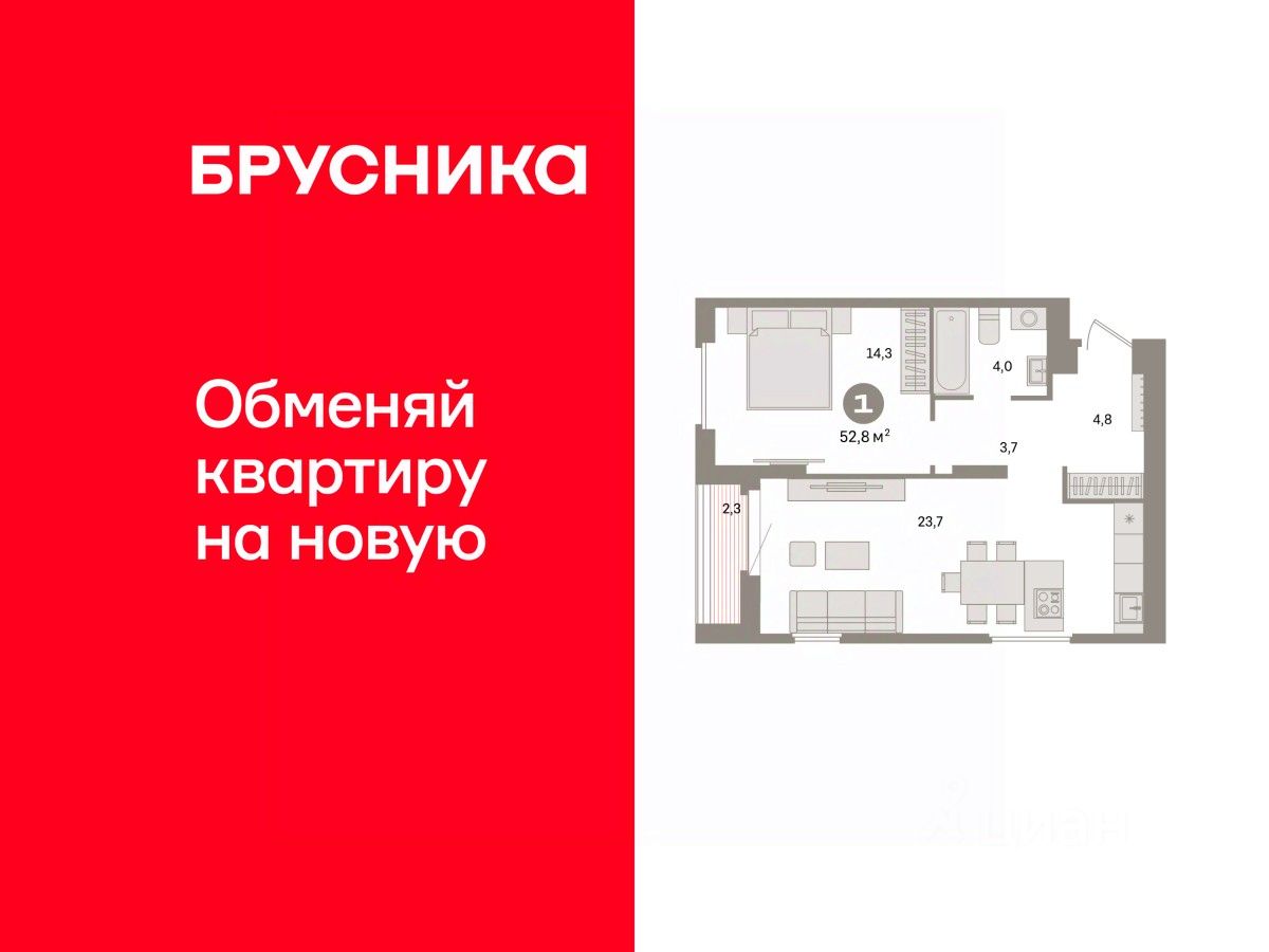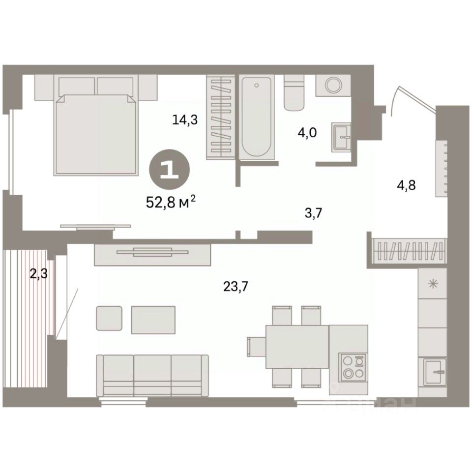 Квартира с кухней-гостиной и одной спальней в квартале ''Депо''. Особенности планировки: предчистовая отделка. квартиры в нашей базе: ДЕП07-Ж1.13.3.