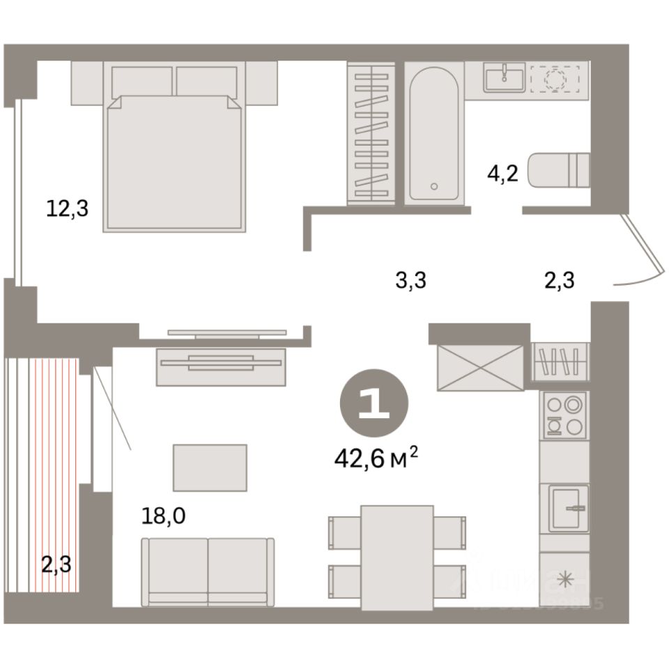 Квартира с кухней-гостиной и одной спальней в квартале ''Депо''. Особенности планировки: предчистовая отделка. квартиры в нашей базе: ДЕП07-Ж1.16.5.