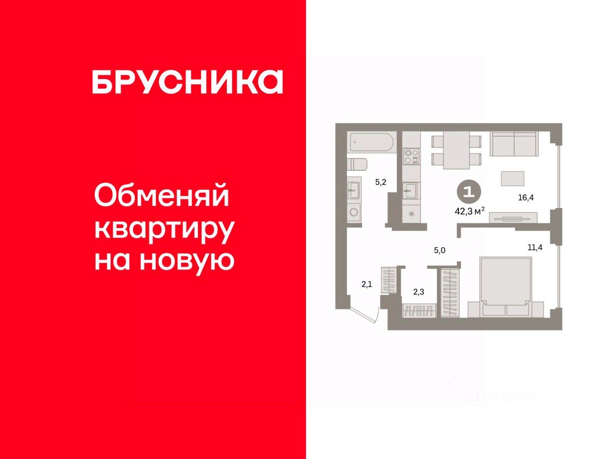 Квартира с кухней-гостиной и одной спальней в квартале ''Депо''. Особенности планировки: предчистовая отделка. квартиры в нашей базе: ДЕП07-Ж6.4.8.
