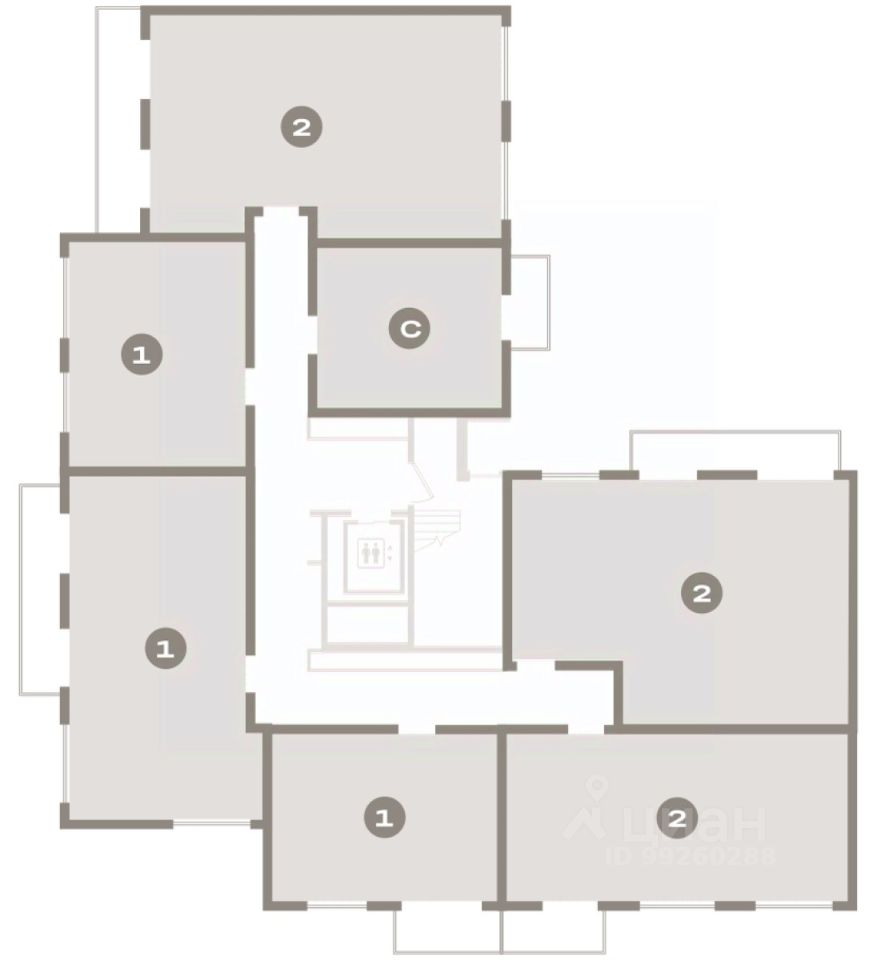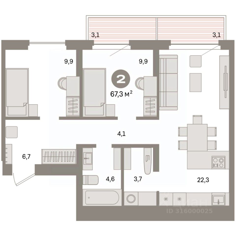 Квартира с кухней-гостиной и двумя спальнями в квартале ''Депо''. Особенности планировки: балкон, предчистовая отделка. квартиры в нашей базе: ДЕП07-Ж6.9.1.