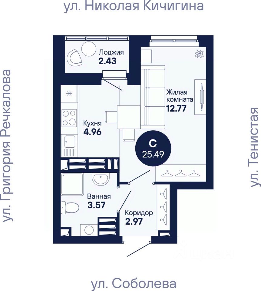 Общая площадь25,49 м2