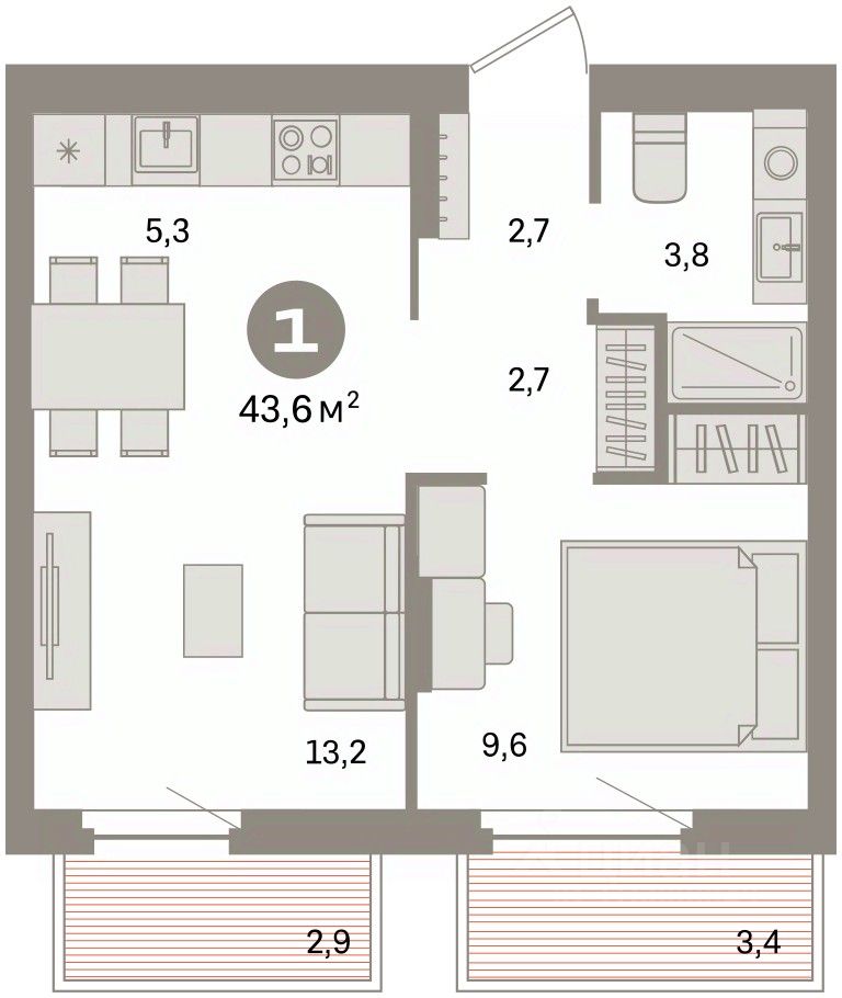 Квартира с кухней-гостиной и одной спальней в квартале ''Депо''. Особенности планировки: балкон, предчистовая отделка. квартиры в нашей базе: ДЕП07-Ж4.4.7.