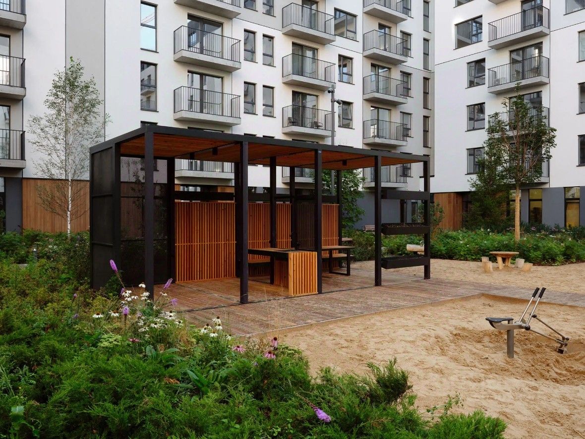Благоустройство квартала основано на трёх принципах. Первый — особое внимание к воде. Архитекторы Брусники создадут внутри застройки систему дождевых садов, которые будут фильтровать сток (в том числе с крыш зданий) и снижать нагрузку на ливневую канализацию .