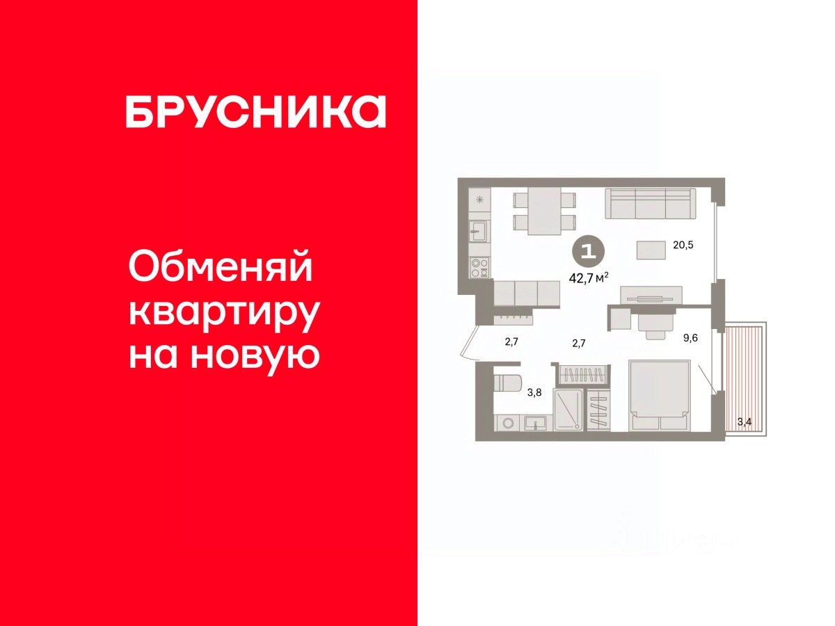 Квартира с кухней-гостиной и одной спальней в квартале ''Депо''. Особенности планировки: балкон, предчистовая отделка. квартиры в нашей базе: ДЕП04-Ж4.7.3.