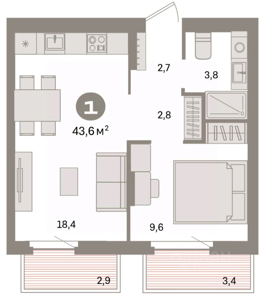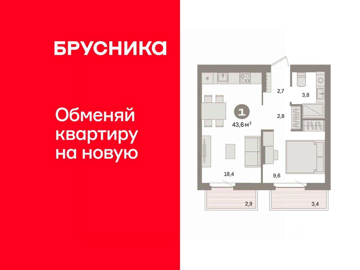 Квартира с кухней-гостиной и одной спальней в квартале ''Депо''. Особенности планировки: балкон, предчистовая отделка. квартиры в нашей базе: ДЕП04-Ж6.7.4.