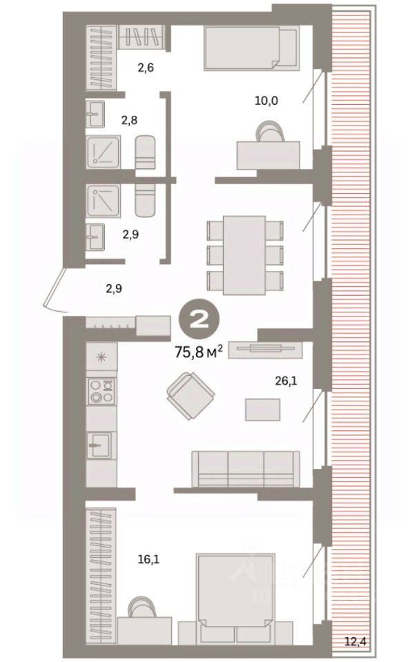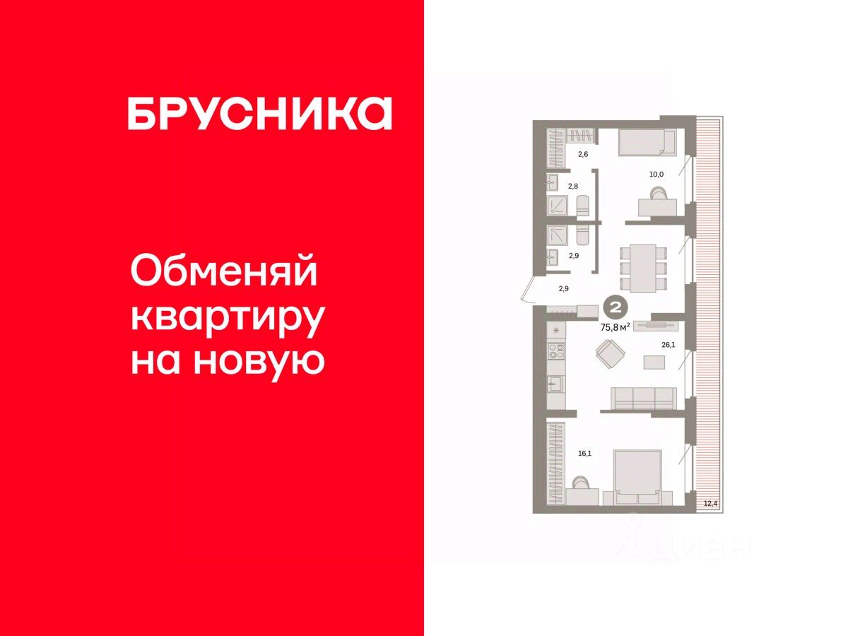 Квартира с кухней-гостиной и двумя спальнями в квартале ''Депо''. Особенности планировки: предчистовая отделка, разнесённые спальни, терраса на крыше. квартиры в нашей базе: ДЕП04-Ж5.8.2.
