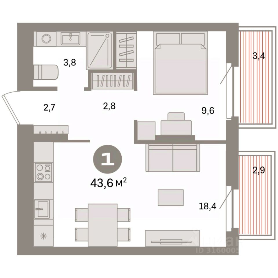 Квартира с кухней-гостиной и одной спальней в квартале ''Депо''. Особенности планировки: балкон, предчистовая отделка. квартиры в нашей базе: ДЕП04-Ж4.3.7.