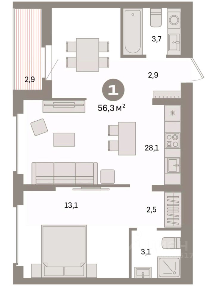 Квартира с кухней-гостиной и одной спальней в квартале ''Депо''. Особенности планировки: предчистовая отделка. квартиры в нашей базе: ДЕП04-Ж1.8.5.
