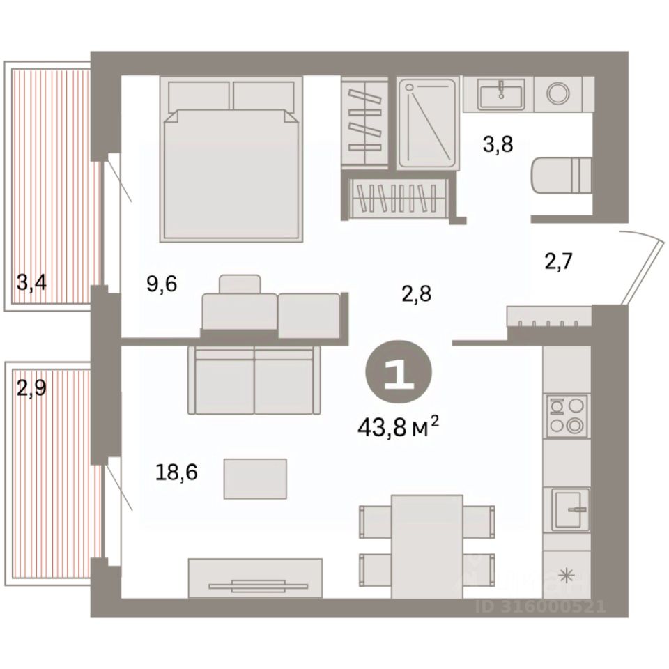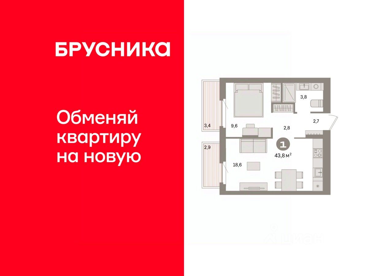 Квартира с кухней-гостиной и одной спальней в квартале ''Депо''. Особенности планировки: балкон, предчистовая отделка. квартиры в нашей базе: ДЕП04-Ж8.3.5.