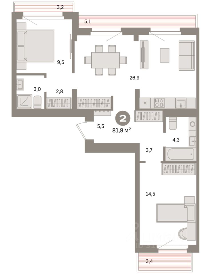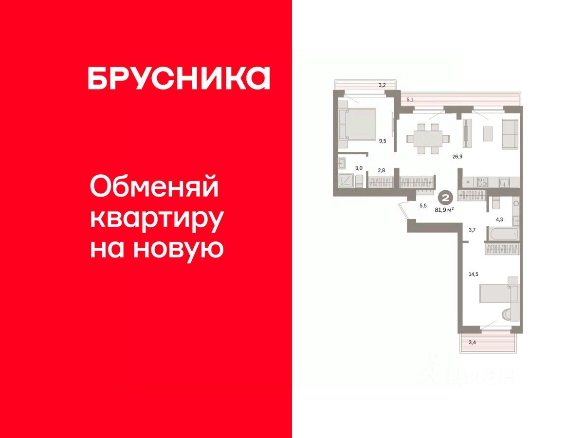Квартира с кухней-гостиной и двумя спальнями в квартале ''Депо''. Особенности планировки: балкон, окна на две стороны, предчистовая отделка, разнесённые спальни, терраса на крыше. квартиры в нашей базе: ДЕП04-Ж2.7.3.