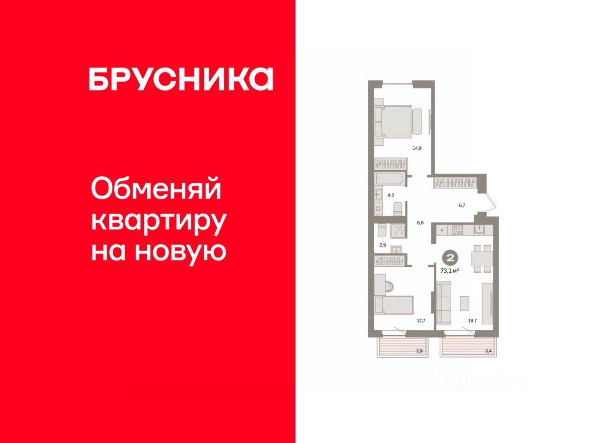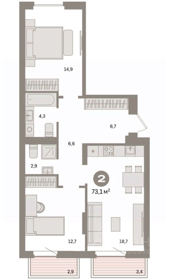 Квартира с кухней-гостиной и двумя спальнями в квартале ''Депо''. Особенности планировки: балкон, вид во двор, второй санузел, окна на две стороны, предчистовая отделка, разнесённые спальни. квартиры в нашей базе: ДЕП04-Ж5.5.6.