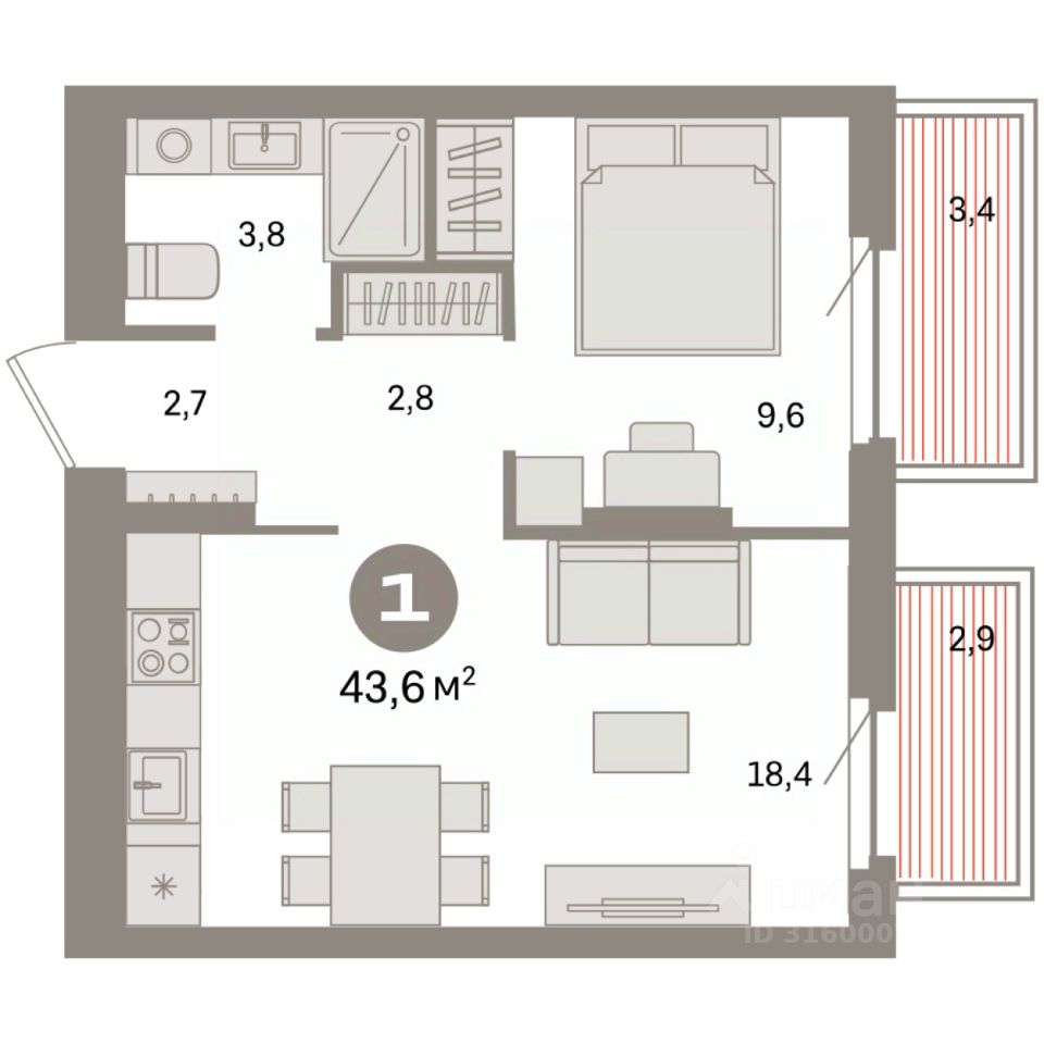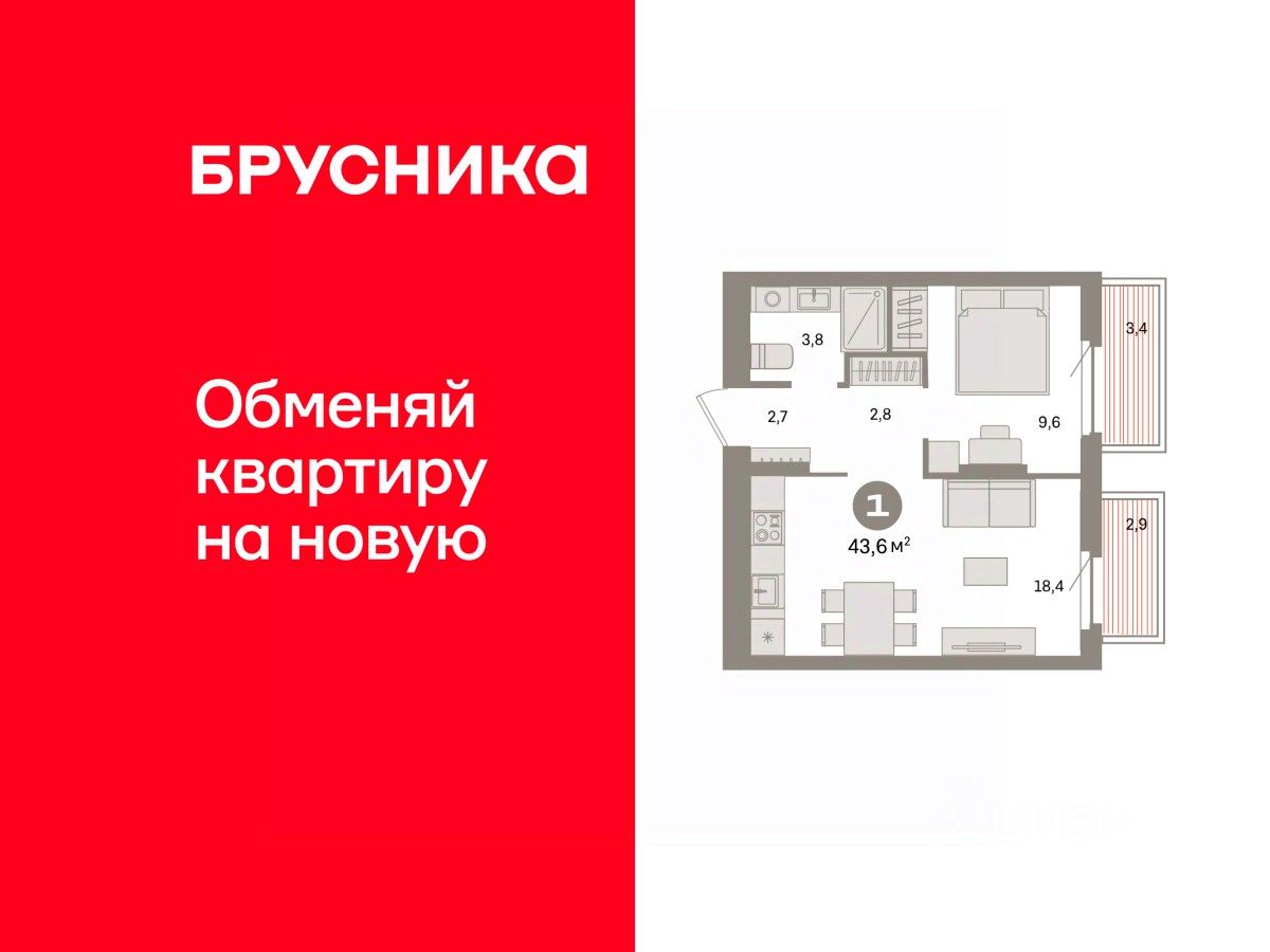 Квартира с кухней-гостиной и одной спальней в квартале ''Депо''. Особенности планировки: балкон, предчистовая отделка. квартиры в нашей базе: ДЕП04-Ж4.4.7.