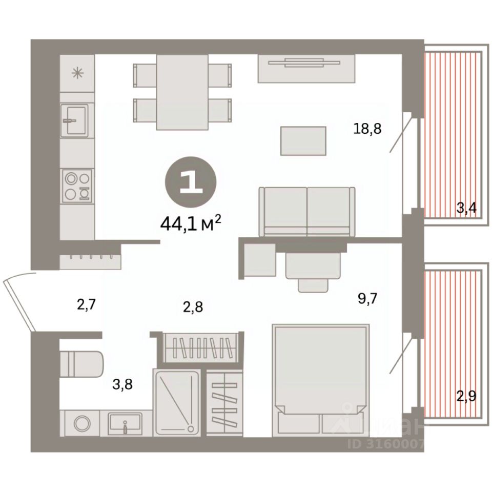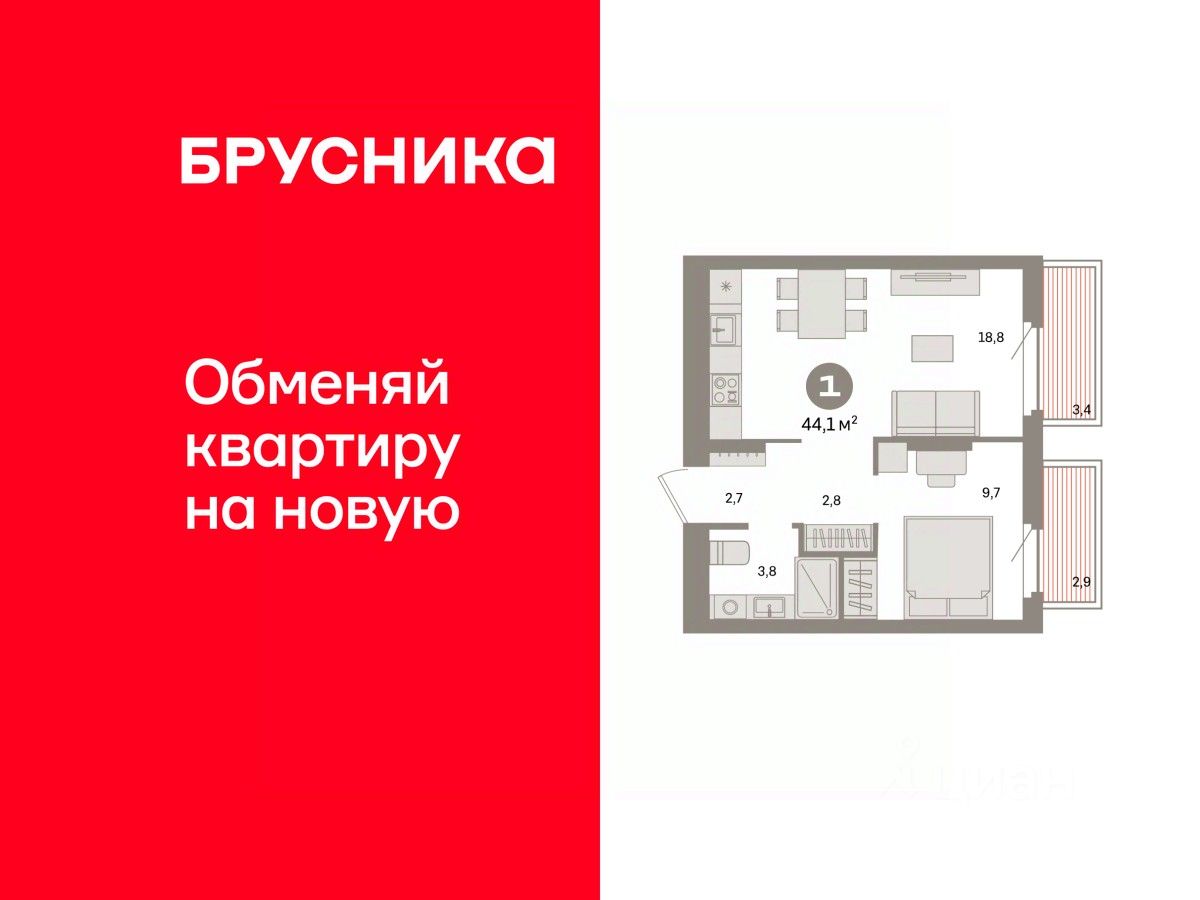 Квартира с кухней-гостиной и одной спальней в квартале ''Депо''. Особенности планировки: балкон, предчистовая отделка. квартиры в нашей базе: ДЕП04-Ж5.2.3.