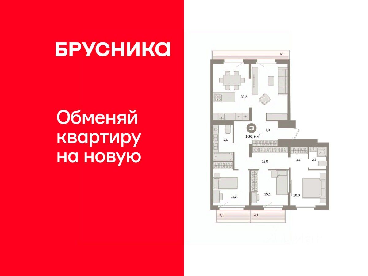 Квартира с кухней-гостиной и тремя спальнями в квартале ''Депо''. Особенности планировки: балкон, окна на две стороны, предчистовая отделка, разнесённые спальни, терраса на крыше. квартиры в нашей базе: ДЕП04-Ж4.8.1.